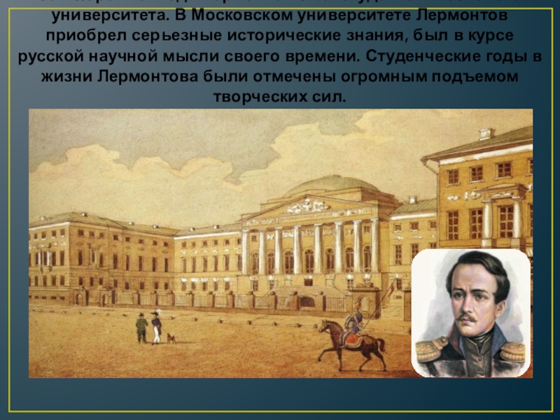 университете Лермонтов приобрел серьезные исторические знания, был в курсе русской научной мысли своего времени. Студенческие годы в жизни Лермонтова были отмечены огромным подъемом творческих сил.