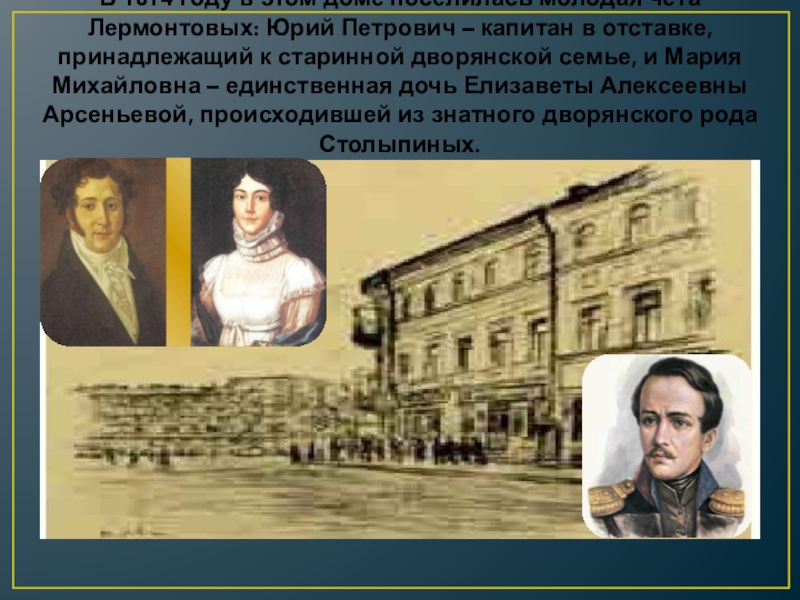 Слайд 9В 1814 году в этом доме поселилась молодая чета Лермонтовых: Юрий