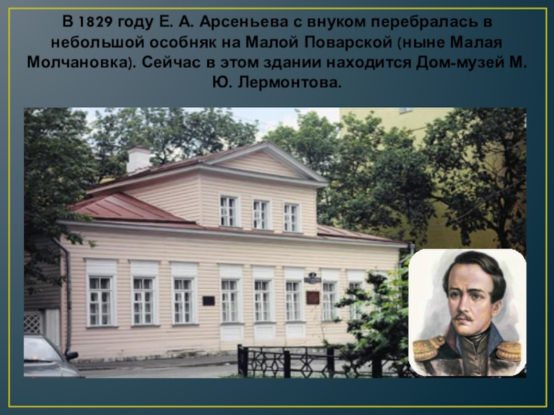 особняк на Малой Поварской (ныне Малая Молчановка). Сейчас в этом здании находится Дом-музей М. Ю. Лермонтова.