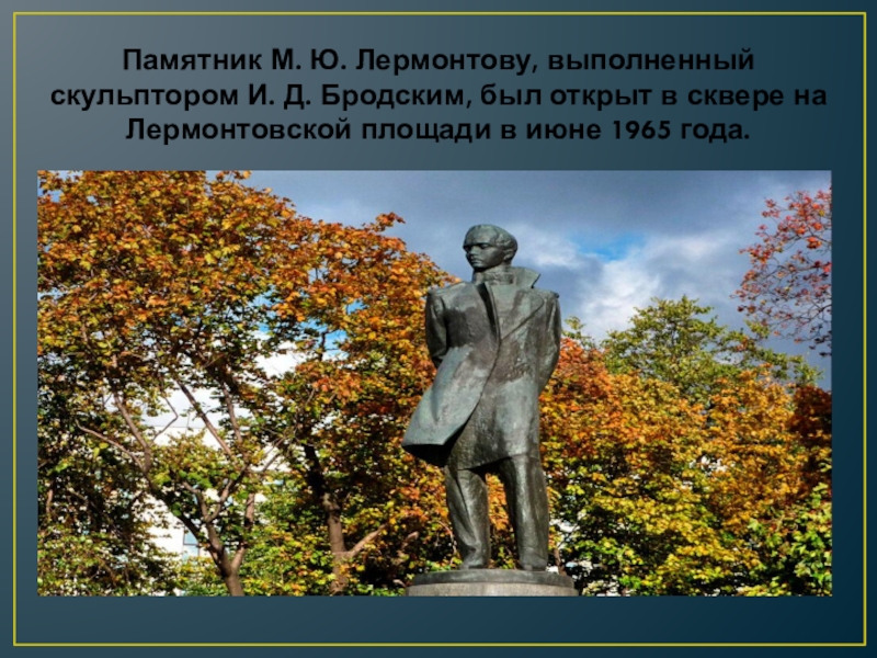 Слайд 17Памятник М. Ю. Лермонтову, выполненный скульптором И. Д. Бродским, был открыт