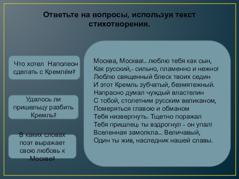 Слайд 35Ответьте на вопросы, используя текст стихотворения.