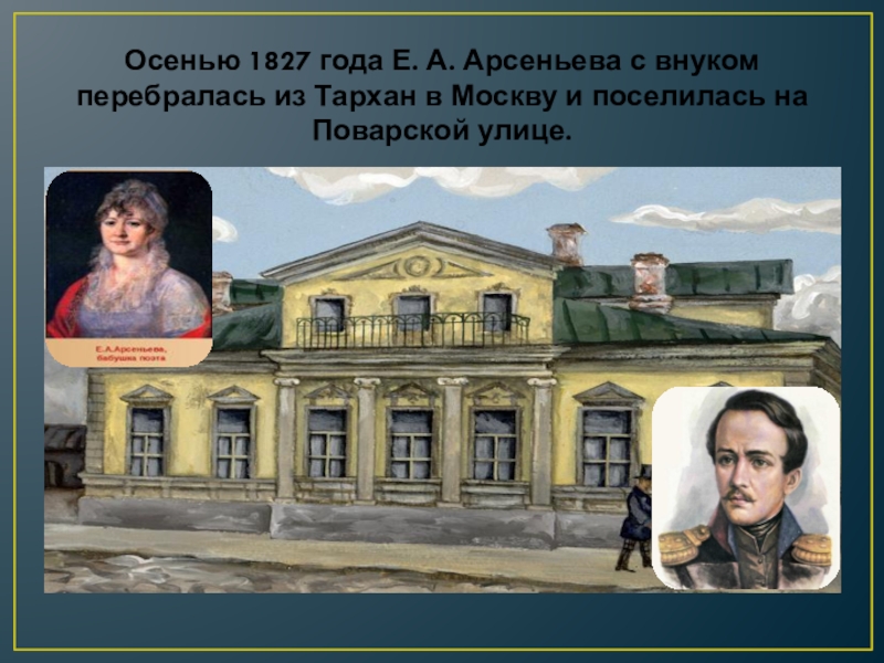Слайд 12Осенью 1827 года Е. А. Арсеньева с внуком перебралась из Тархан