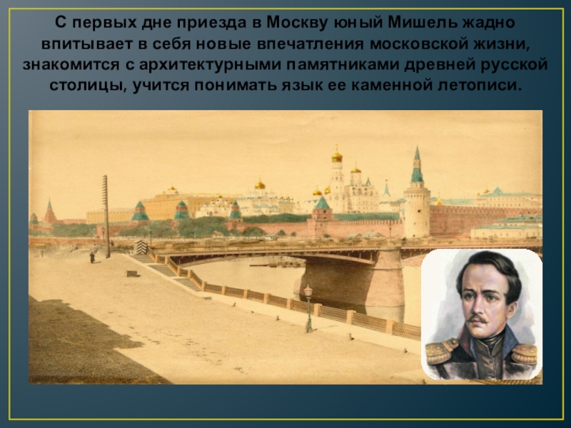 Слайд 13С первых дне приезда в Москву юный Мишель жадно впитывает в