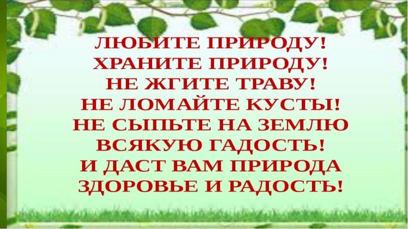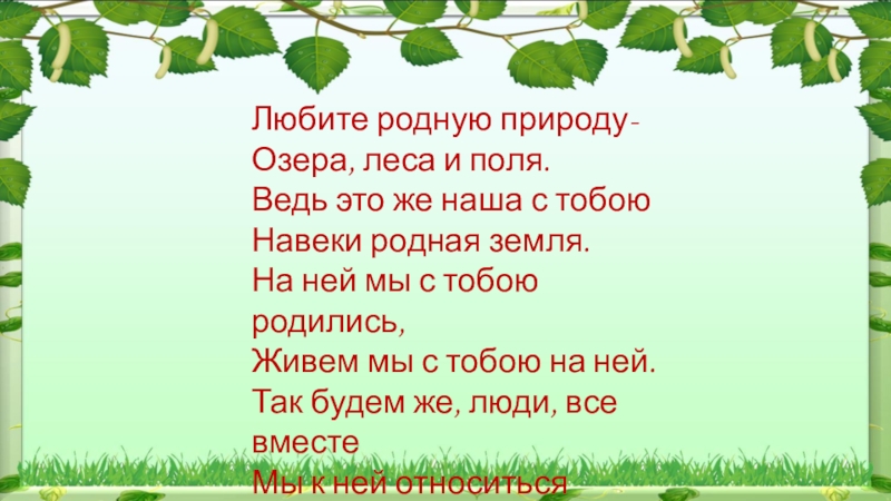 Любите родную природу-Озера, леса и поля.Ведь это же наша с тобоюНавеки родная земля.На ней мы с тобою