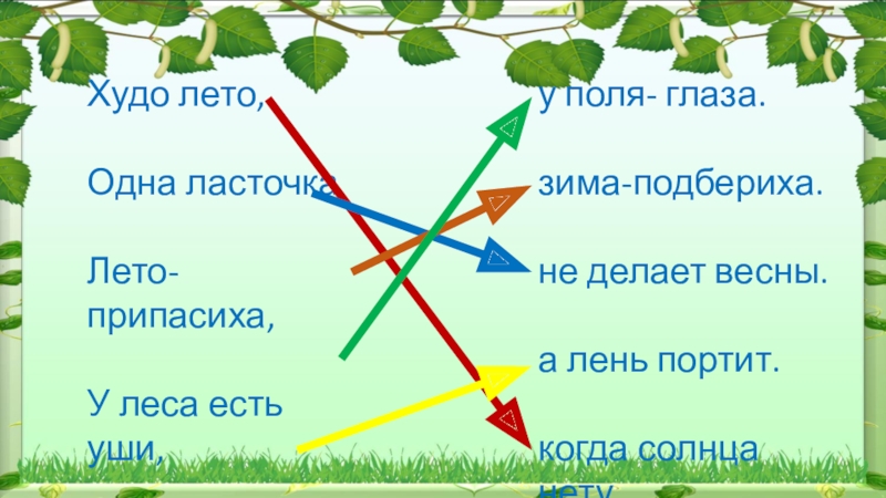 Худо лето,Одна ласточкаЛето-припасиха,У леса есть уши,Труд кормит, у поля- глаза.зима-подбериха.не делает весны.а лень портит.когда солнца нету.