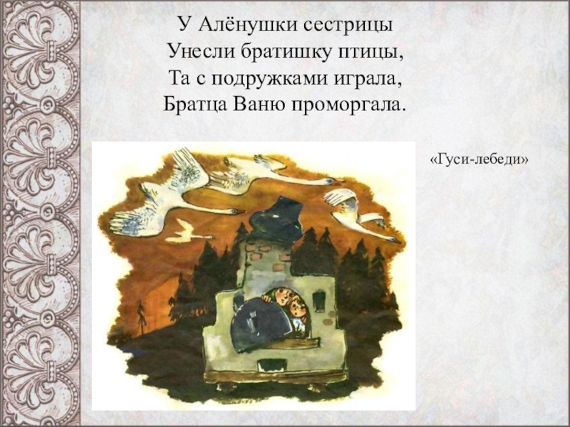 Кого первым встречает героиня сказки "Гуси-лебеди", отправившаяся на поиски брата?