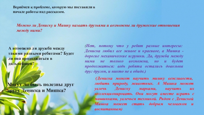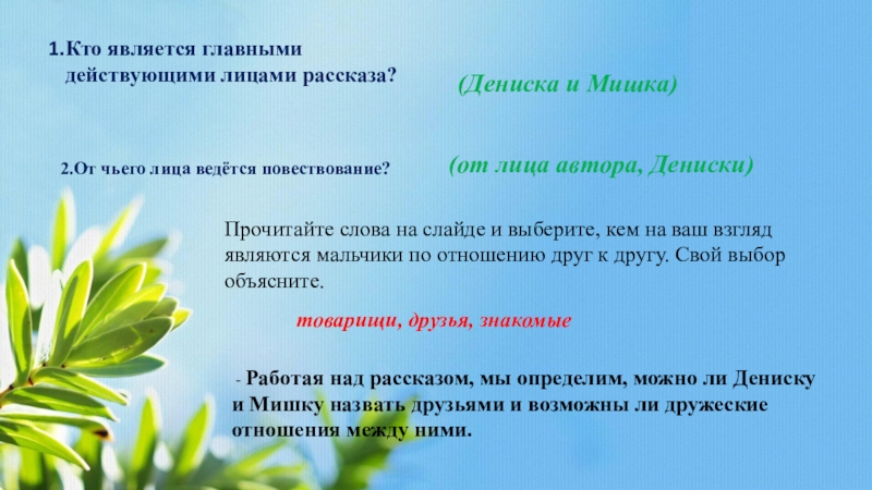 - Работая над рассказом, мы определим, можно ли Дениску и Мишку назвать друзьями и возможны ли дружеские отношения между ними.