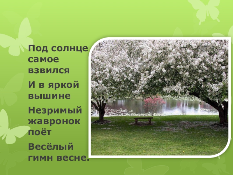 Под солнце самое взвился И в яркой вышине Незримый жавронок поёт Весёлый гимн весне.
