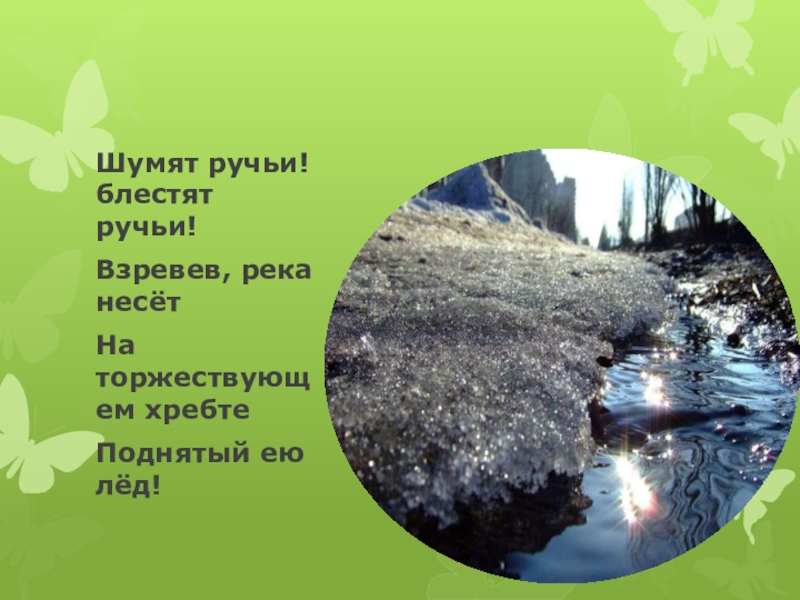 Шумят ручьи! блестят ручьи!Взревев, река несёт На торжествующем хребте Поднятый ею лёд!