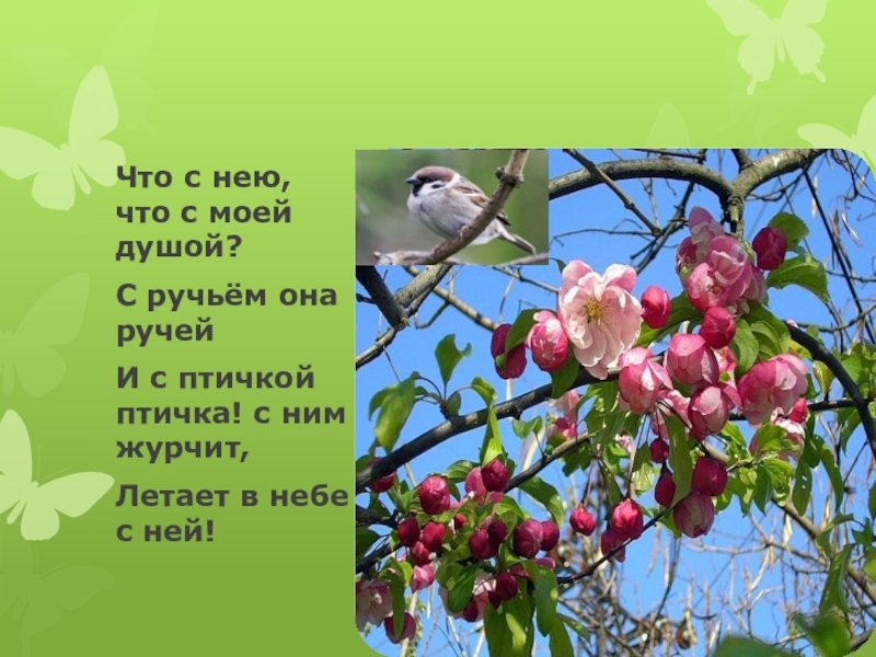 Что с нею, что с моей душой?С ручьём она ручейИ с птичкой птичка! с ним журчит,Летает в