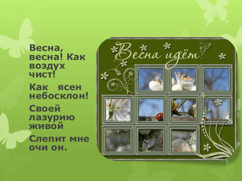 Весна! Весна! как высоко На крыльях ветерка ,Ласкаясь к солнечным лучам,Летают облака!