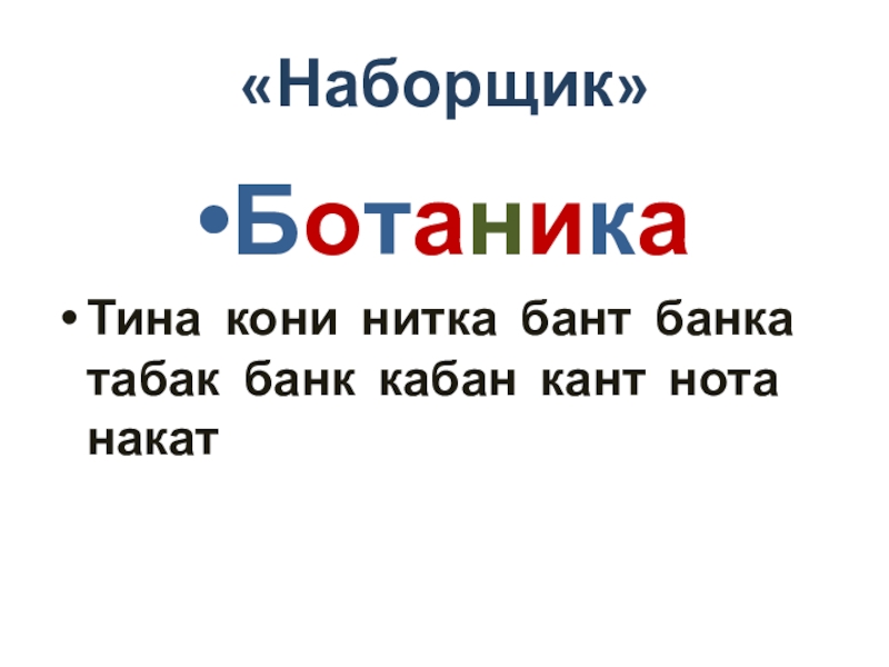 «Наборщик» БотаникаТина кони нитка бант банка табак банк кабан кант нота накат