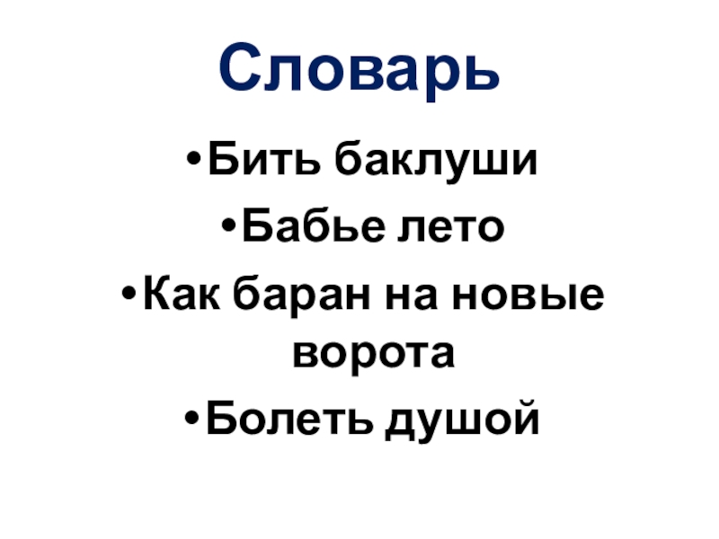 Словарь Бить баклушиБабье летоКак баран на новые воротаБолеть душой