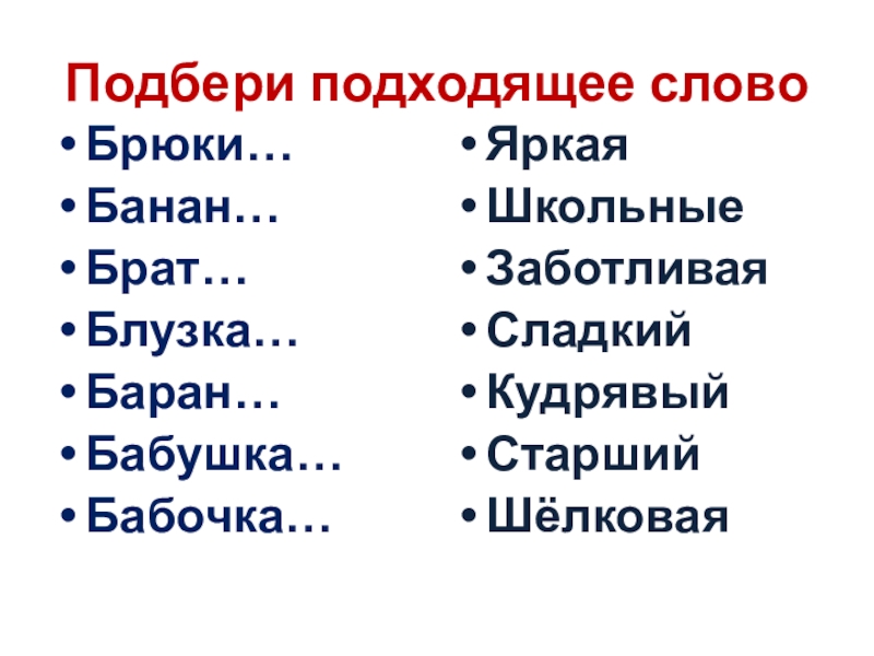 Подбери подходящее словоБрюки…Банан…Брат…Блузка…Баран…Бабушка…Бабочка…ЯркаяШкольныеЗаботливаяСладкийКудрявыйСтаршийШёлковая