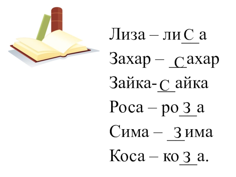 Лиза – ли__аЗахар – __ахарЗайка-__айкаРоса – ро__аСима – __имаКоса – ко__а.СССЗЗЗ
