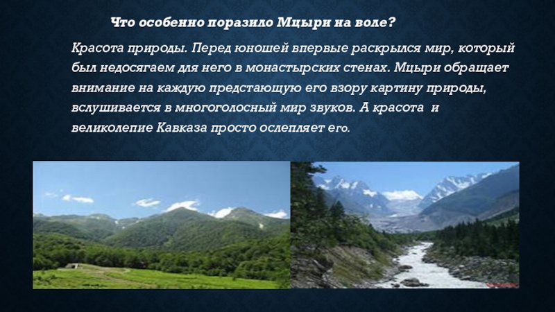 Красота природы. Перед юношей впервые раскрылся мир, который был недосягаем для него в монастырских стенах. Мцыри обращает внимание на каждую предстающую его взору картину природы, вслушивается в многоголосный мир звуков. А красота и великолепие Кавказа просто ослепляет его.