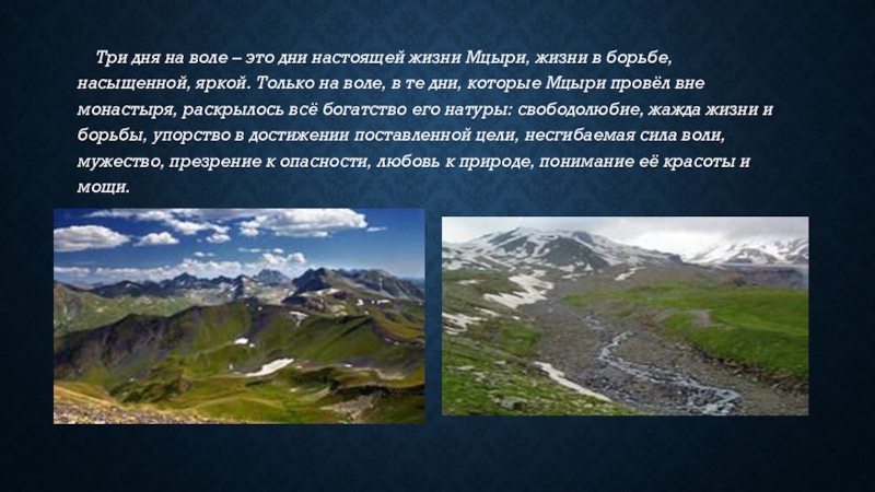 Мцыри, жизни в борьбе, насыщенной, яркой. Только на воле, в те дни, которые Мцыри провёл вне монастыря, раскрылось всё богатство его натуры: свободолюбие, жажда жизни и борьбы, упорство в достижении поставленной цели, несгибаемая сила воли, мужество, презрение к опасности, любовь к природе, понимание её красоты и мощи.