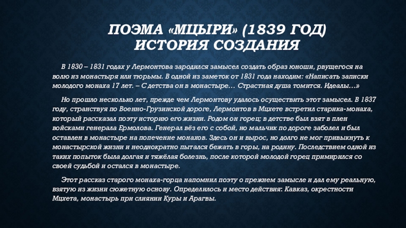 Этот рассказ старого монаха-горца напомнил поэту о прежнем замысле и дал ему реальную, взятую из жизни сюжетную основу. Определилось и место действия: Кавказ, окрестности Мцхета, монастырь при слиянии Куры и Арагвы.