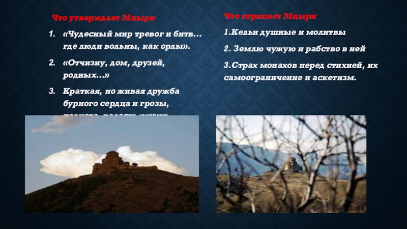 тюрьмы на этот свет родимся мы». Он видел, как монахи добровольно отреклись от всех радостей жизни. И поэтому Мцыри стремился также «узнать, прекрасна ли земля».