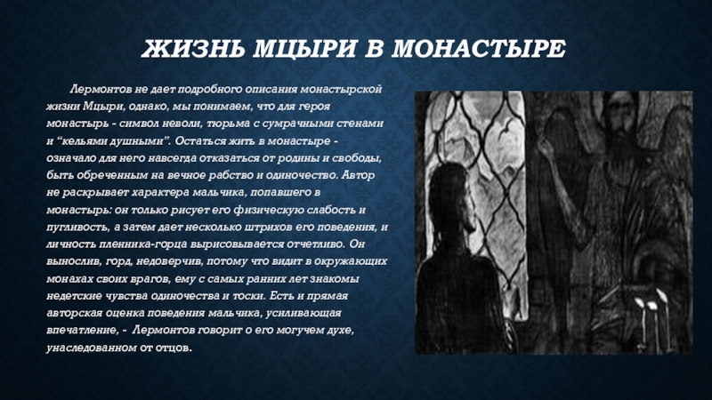 подробного описания монастырской жизни Мцыри, однако, мы понимаем, что для героя монастырь - символ неволи, тюрьма с сумрачными стенами и “кельями душными”. Остаться жить в монастыре - означало для него навсегда отказаться от родины и свободы, быть обреченным на вечное рабство и одиночество. Автор не раскрывает характера мальчика, попавшего в монастырь: он только рисует его физическую слабость и пугливость, а затем дает несколько штрихов его поведения, и личность пленника-горца вырисовывается отчетливо. Он вынослив, горд, недоверчив, потому что видит в окружающих монахах своих врагов, ему с самых ранних лет знакомы недетские чувства одиночества и тоски. Есть и прямая авторская оценка поведения мальчика, усиливающая впечатление, - Лермонтов говорит о его могучем духе, унаследованном от отцов.