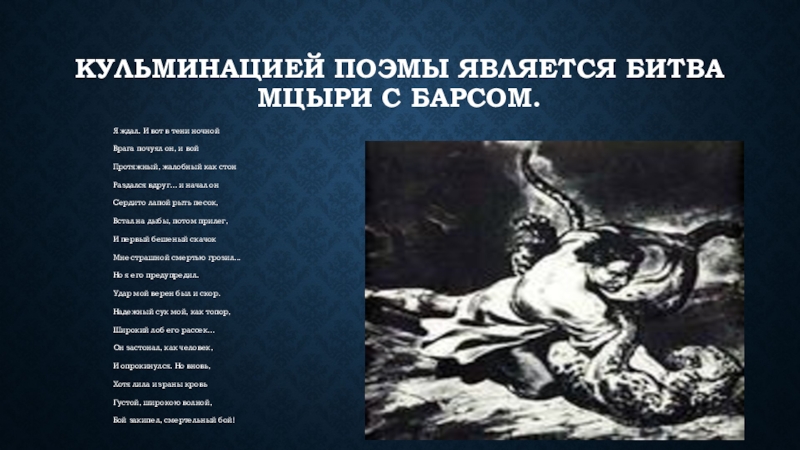 Слайд 15Кульминацией поэмы является битва Мцыри с барсом.
