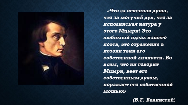 за исполинская натура у этого Мцыри! Это любимый идеал нашего поэта, это отражение в поэзии тени его собственной личности. Во всем, что ни говорит Мцыри, веет его собственным духом, поражает его собственной мощью»
