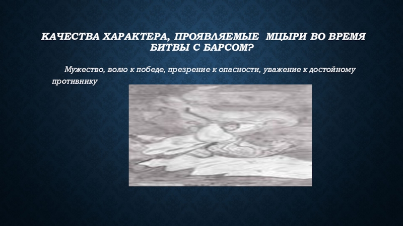 Слайд 16 качества характера, проявляемые Мцыри во время битвы с барсом?
