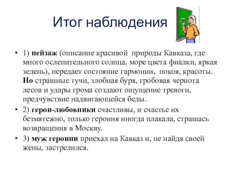 природы Кавказа, где много ослепительного солнца, море цвета фиалки, яркая зелень), передает состояние гармонии, покоя, красоты. Но страшные тучи, злобная буря, гробовая чернота лесов и удары грома создают ощущение тревоги, предчувствие надвигающейся беды.