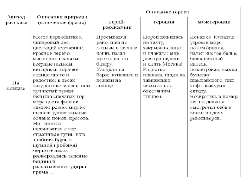 сравните описание природы и героев в следующих эпизодах рассказа, выписав из текста необходимые ключевые фразы или слова в таблицу: