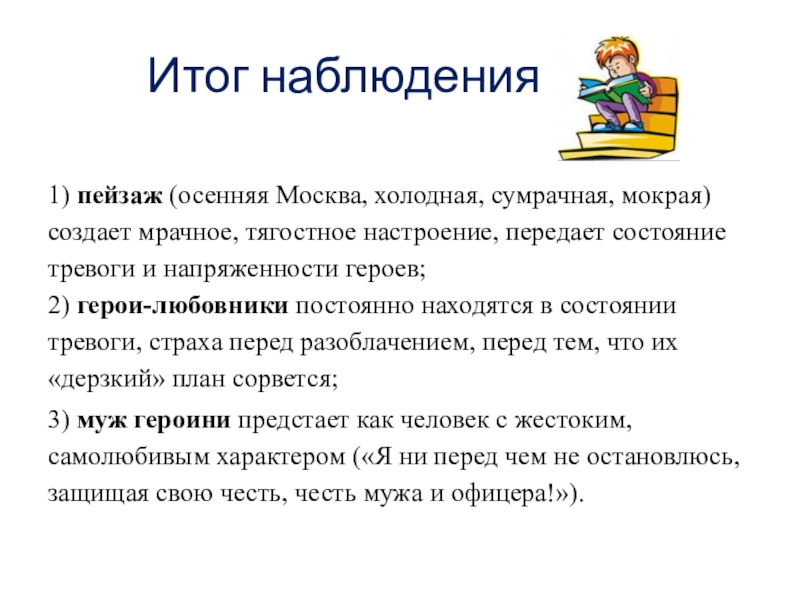 сумрачная, мокрая) создает мрачное, тягостное настроение, передает состояние тревоги и напряженности героев; 2) герои-любовники постоянно находятся в состоянии тревоги, страха перед разоблачением, перед тем, что их «дерзкий» план сорвется;