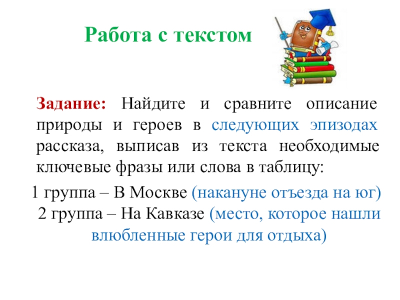 1 группа – В Москве (накануне отъезда на юг) 2 группа – На Кавказе (место, которое нашли влюбленные герои для отдыха)