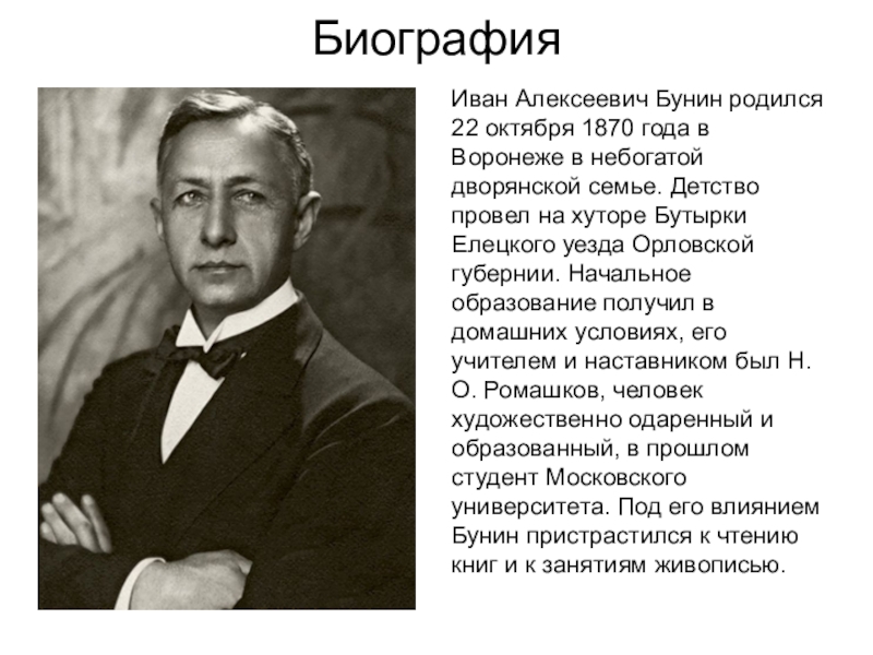 небогатой дворянской семье. Детство провел на хуторе Бутырки Елецкого уезда Орловской губернии. Начальное образование получил в домашних условиях, его учителем и наставником был Н.О. Ромашков, человек художественно одаренный и образованный, в прошлом студент Московского университета. Под его влиянием Бунин пристрастился к чтению книг и к занятиям живописью.