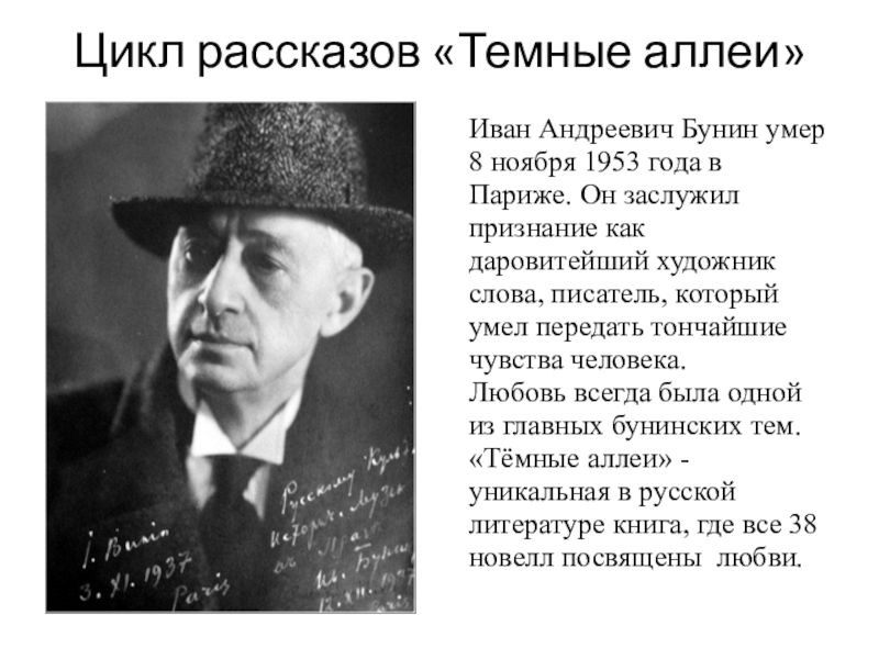 в Париже. Он заслужил признание как даровитейший художник слова, писатель, который умел передать тончайшие чувства человека. Любовь всегда была одной из главных бунинских тем. «Тёмные аллеи» - уникальная в русской литературе книга, где все 38 новелл посвящены любви.