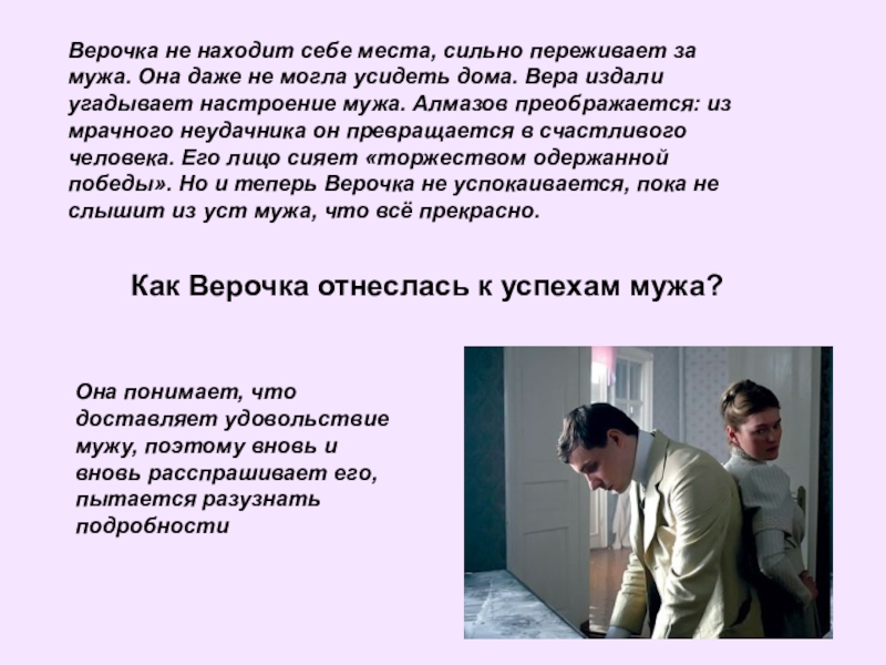 Она понимает, что доставляет удовольствие мужу, поэтому вновь и вновь расспрашивает его, пытается разузнать подробности