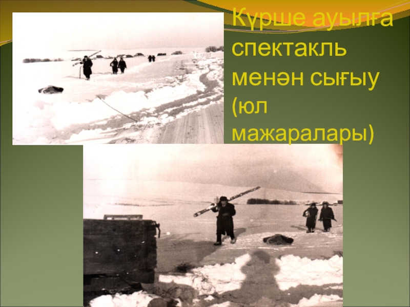 Слайд 7Күрше ауылға спектакль менән сығыу (юл мажаралары)