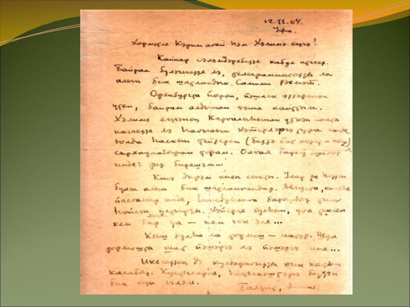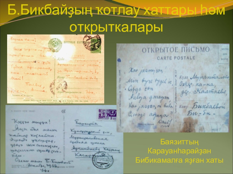 Слайд 13Б.Бикбайҙың ҡотлау хаттары һәм открыткалары