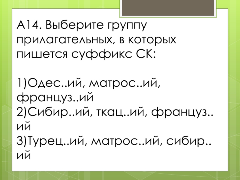Слайд 15А14. Выберите группу прилагательных, в которых пишется суффикс СК: