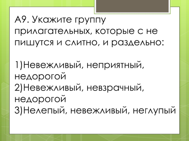 Слайд 10А9. Укажите группу прилагательных, которые с не пишутся и слитно, и