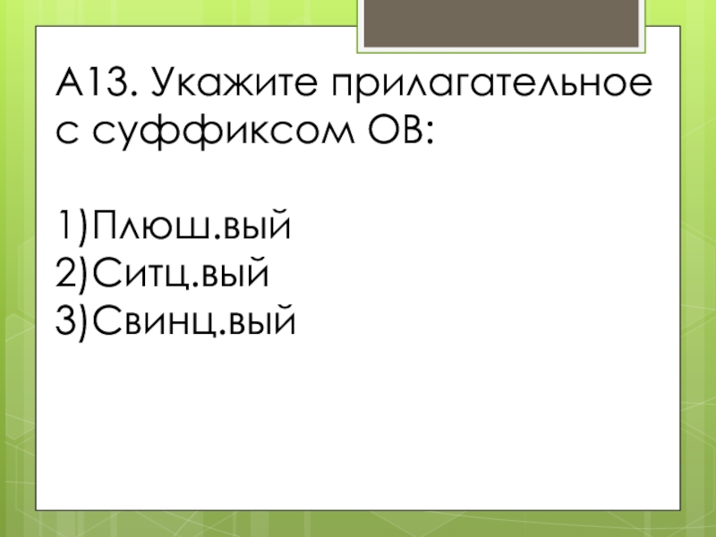 Слайд 14А13. Укажите прилагательное с суффиксом ОВ: