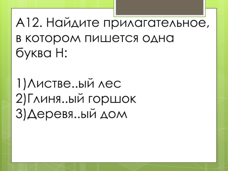 Слайд 13А12. Найдите прилагательное, в котором пишется одна буква Н: