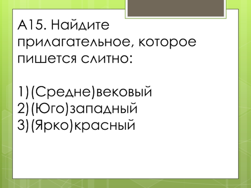 Слайд 16А15. Найдите прилагательное, которое пишется слитно: