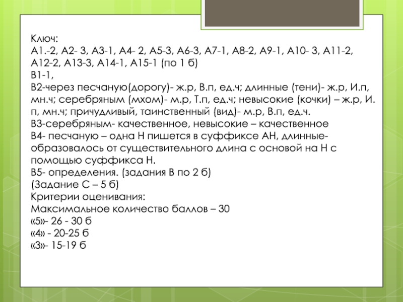 В2-через песчаную(дорогу)- ж.р, В.п, ед.ч; длинные (тени)- ж.р, И.п, мн.ч; серебряным (мхом)- м.р, Т.п, ед.ч; невысокие (кочки) – ж.р, И.п, мн.ч; причудливый, таинственный (вид)- м.р, В.п, ед.ч.
