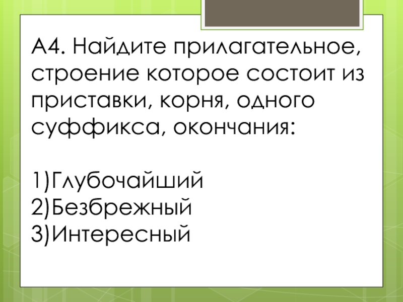 Слайд 5А4. Найдите прилагательное, строение которое состоит из приставки, корня, одного суффикса,