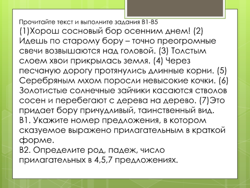 В2. Определите род, падеж, число прилагательных в 4,5,7 предложениях.