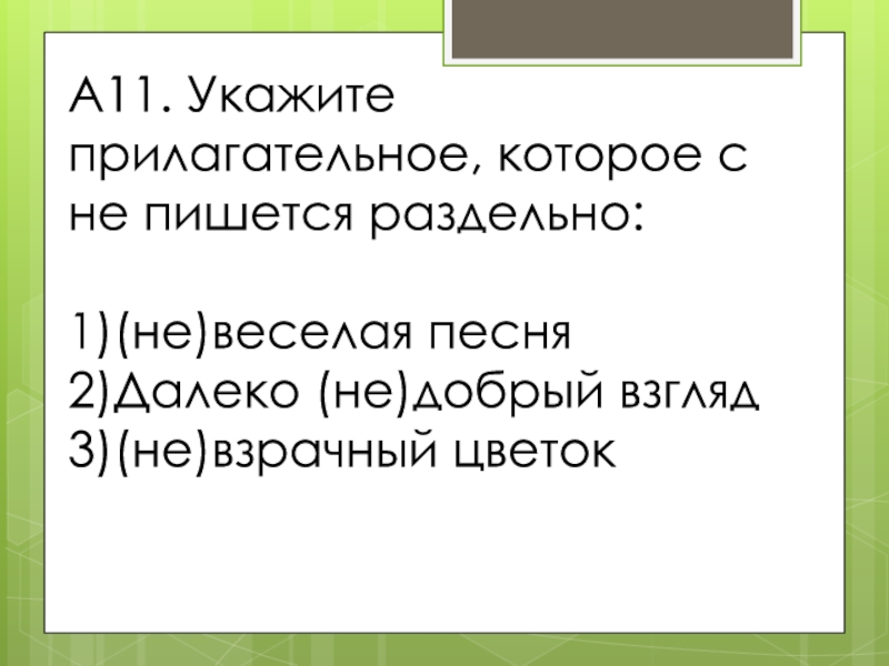 Слайд 12А11. Укажите прилагательное, которое с не пишется раздельно: