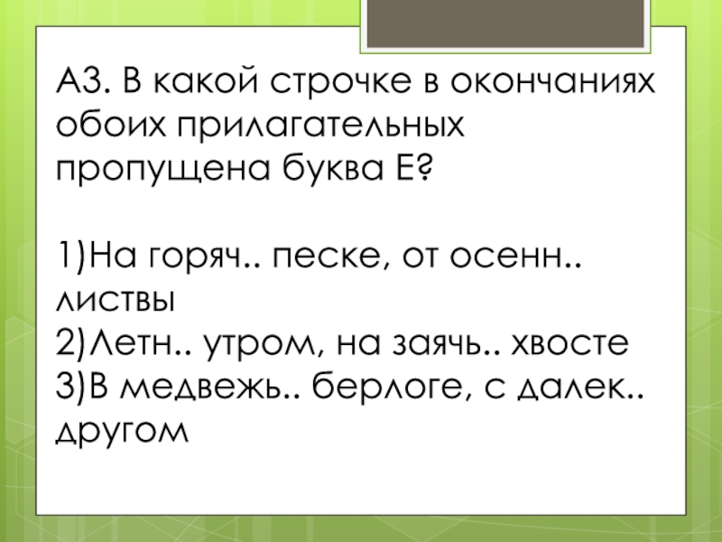 Слайд 4А3. В какой строчке в окончаниях обоих прилагательных пропущена буква Е?