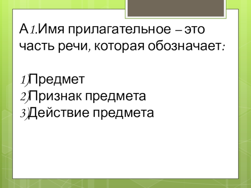 Слайд 2А1.Имя прилагательное – это часть речи, которая обозначает: