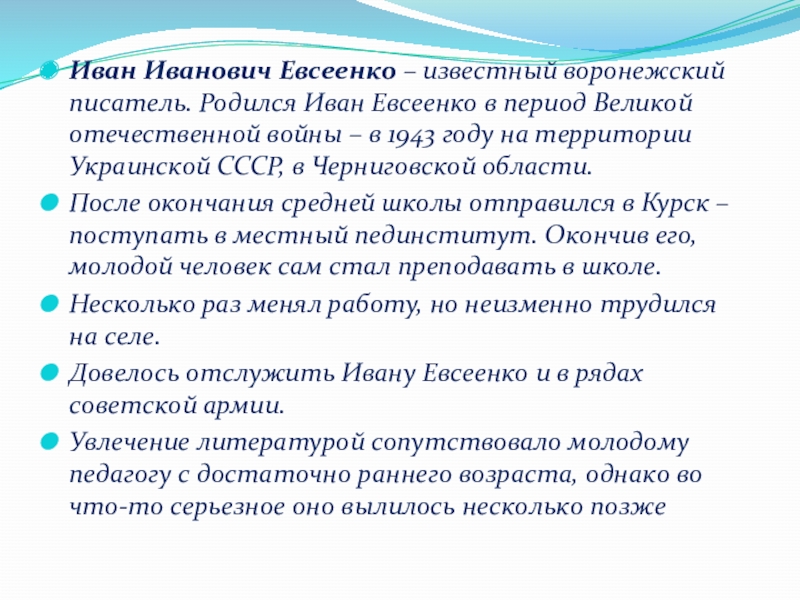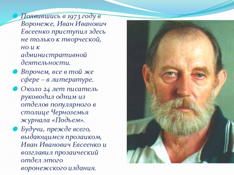 Слайд 2Иван Иванович Евсеенко – известный воронежский писатель. Родился Иван Евсеенко в