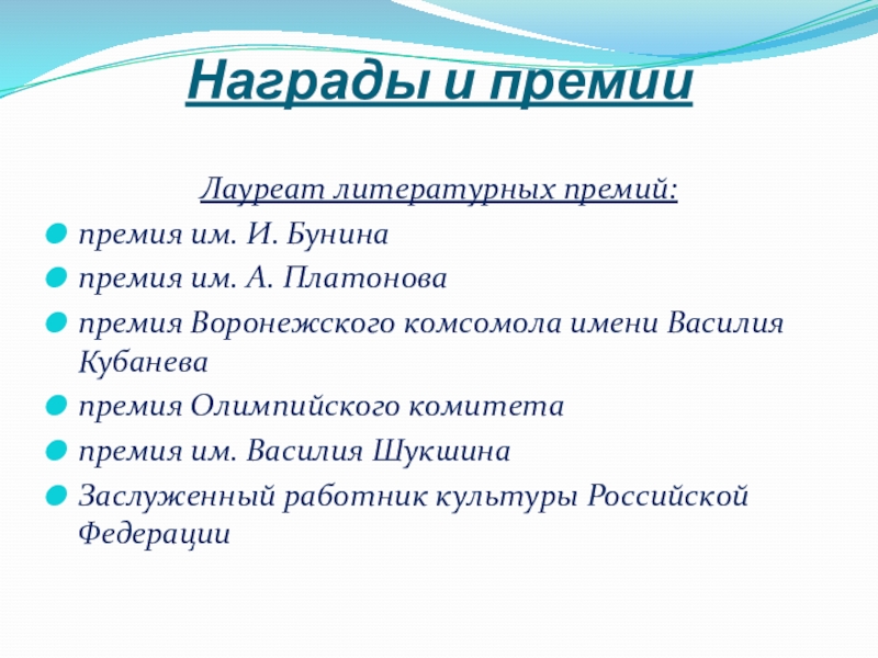 Награды и премии Лауреат литературных премий:премия им. И. Бунинапремия им. А. Платоновапремия Воронежского комсомола имени Василия Кубаневапремия