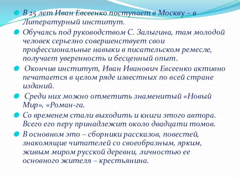 Слайд 3В 25 лет Иван Евсеенко поступает в Москву – в Литературный